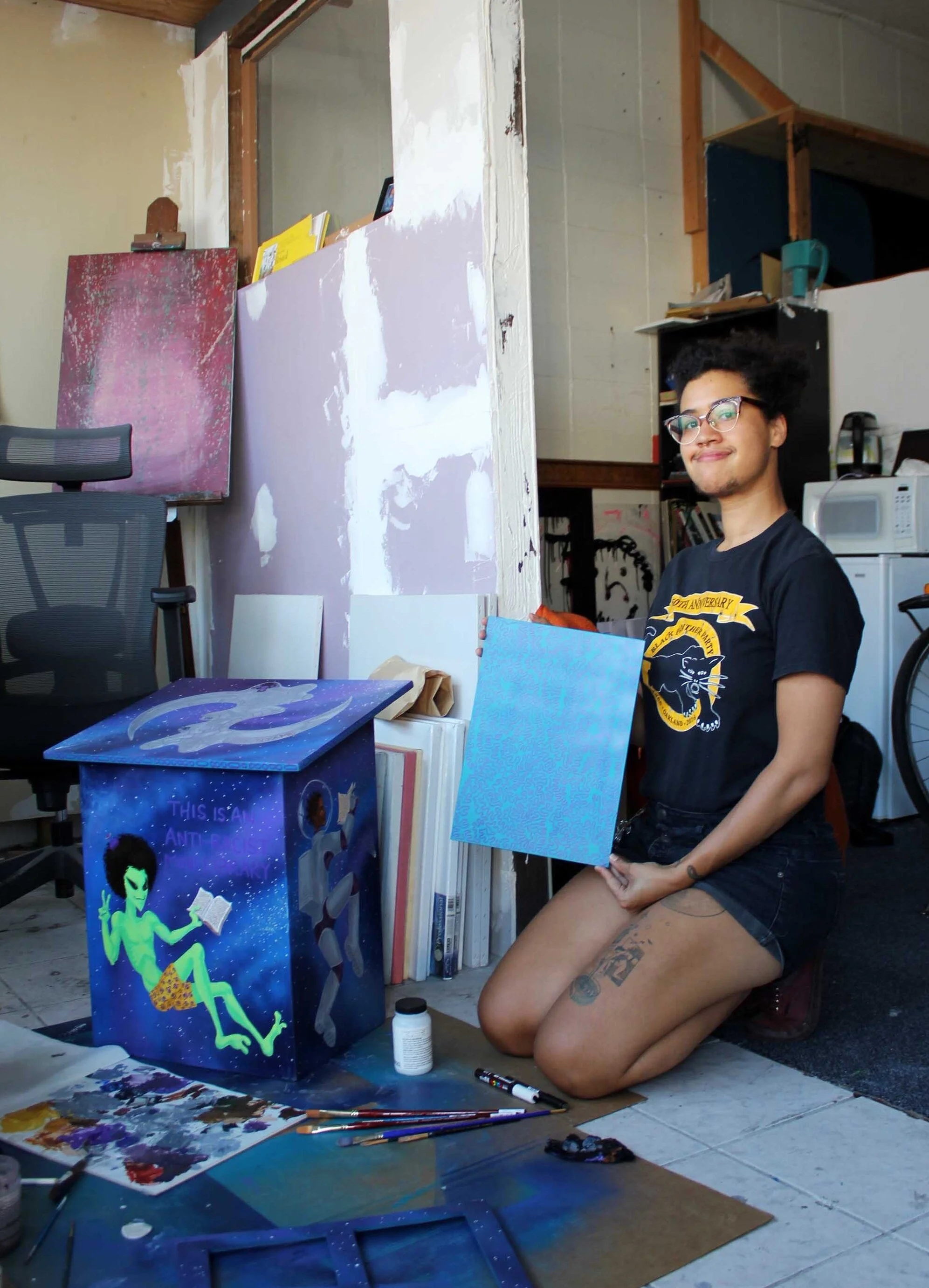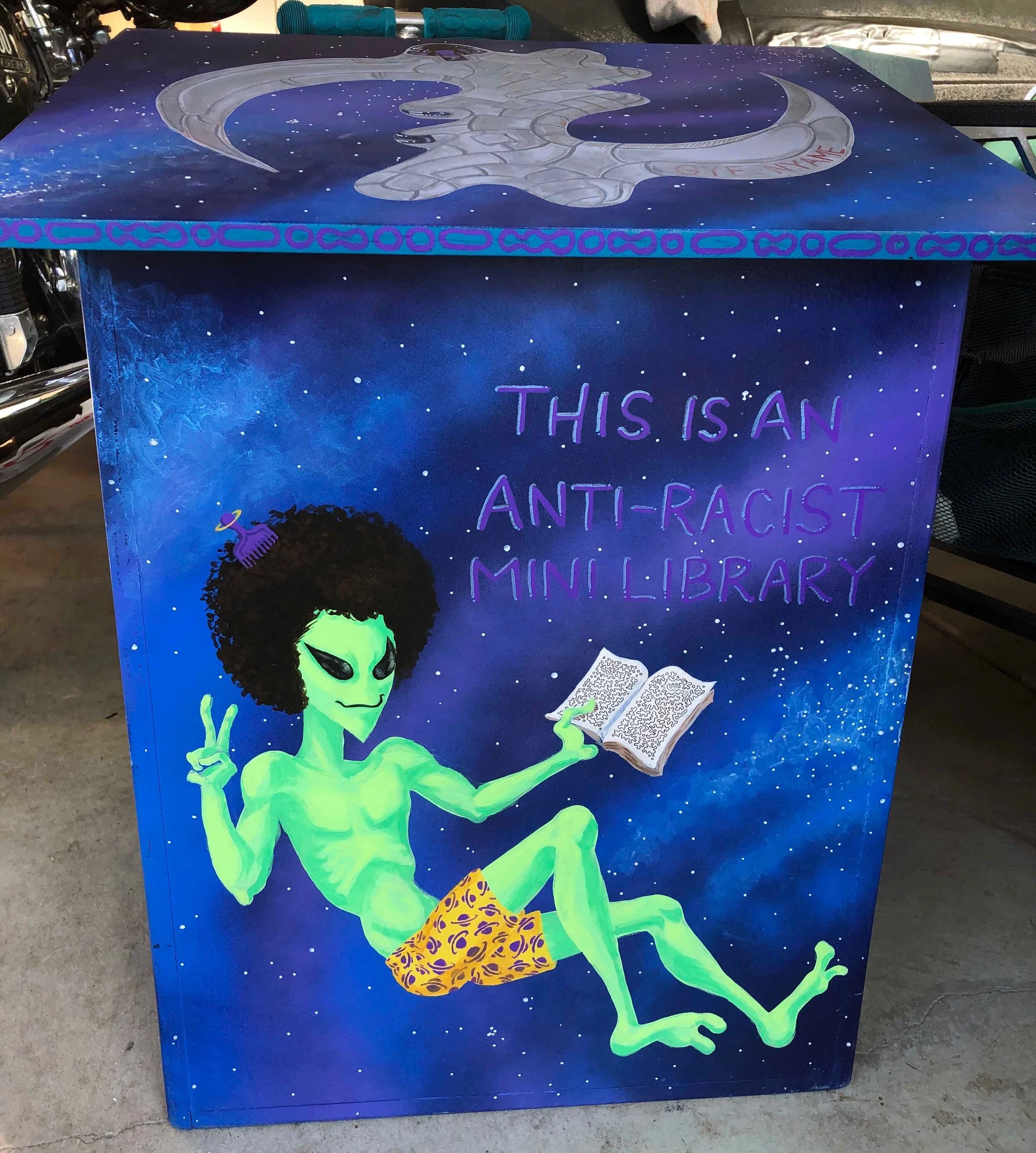 Creating the Little Free Antiracist Library was a very organic process, for me, and went through multiple iterations. The original idea for this library was to do a series of “cosmic portraits” of Black women authors whose work I greatly admire. The list of artists included Audre Lorde, Gwendolyn Brooks, Lorraine Hansberry, Maya Angelou, Ntozake Shange, Octavia Butler, Toni Morrison, and Zora Neale Hurston.